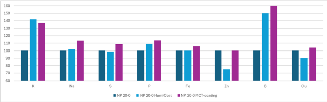 In de figuur is het resultaat te zien van een proef in 4 herhalingen, uitgevoerd door Cultus, waarin opname van diverse nutriënten is gemeten in een jong gewas. De gehaltes in de standaard 20% N maismest zijn op 100 gesteld. De blauwe balk is de huidige HumiCoat en de paarse balk is de nieuwe MCT-coating. Deze verbeterde opname draagt bij aan de verbeterde opbrengst in zowel drogestof als zetmeel die bij de MCT-coating minimaal vergelijkbaar en vaak hoger is dan bij HumiCoat.