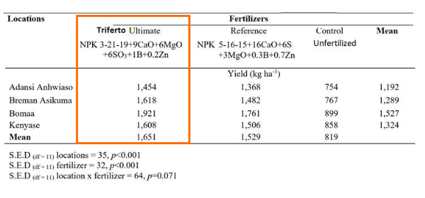 Cacaoplantages bemest met Novagran Cacao realiseerden de hoogste opbrengst, met gemiddeld 1.651 kg per hectare. Ter vergelijking: 1.529 kg per hectare met een referentiemeststof en 819 kg per hectare zonder bemesting.